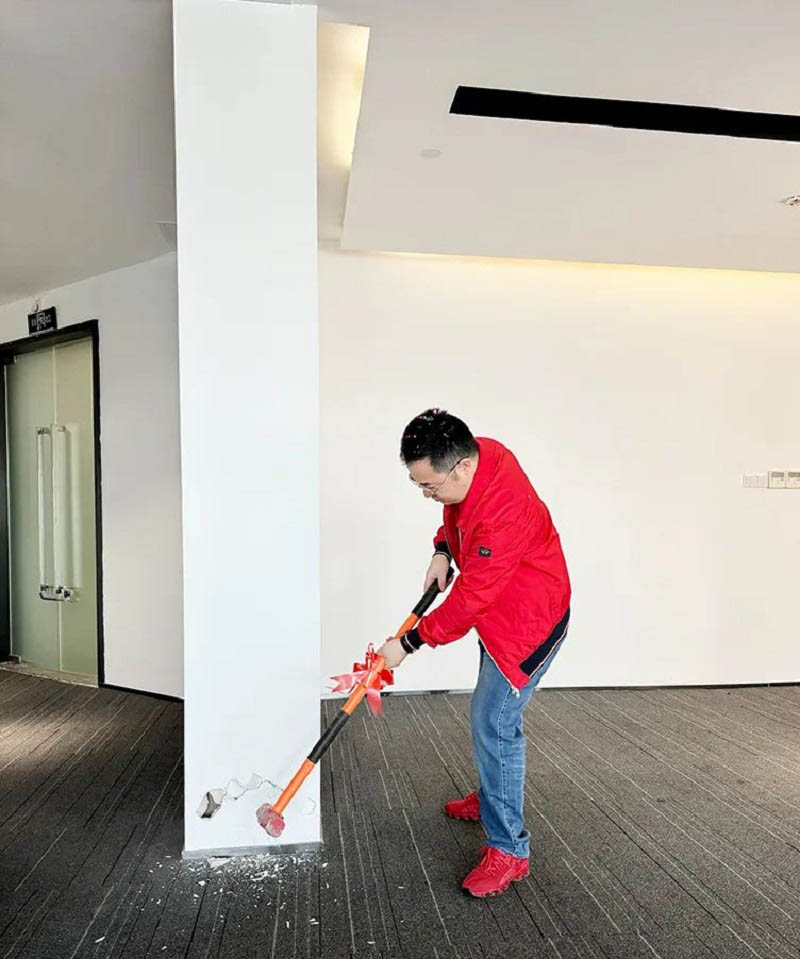紅桌、紅錘、紅毯,色澤鮮亮紅潤的乳豬,紅紅火火!一錘開工大吉,二錘財(cái)源廣進(jìn),三錘萬事如意!伴隨著禮花的綻放,合景人手握禮錘,一同為新辦公區(qū)裝修開工儀式揭開序幕。在熱烈的掌聲中,大家共同慶祝辦公樓裝修工程的正式啟動!